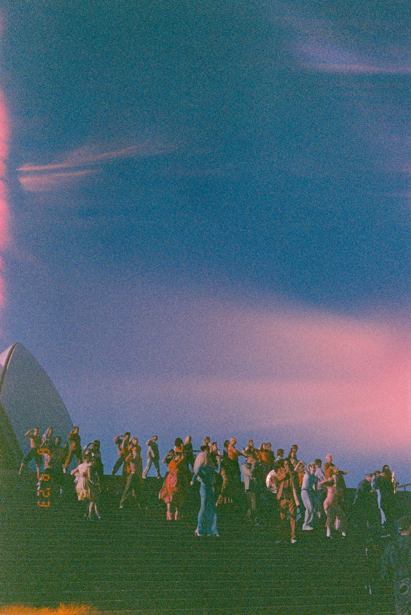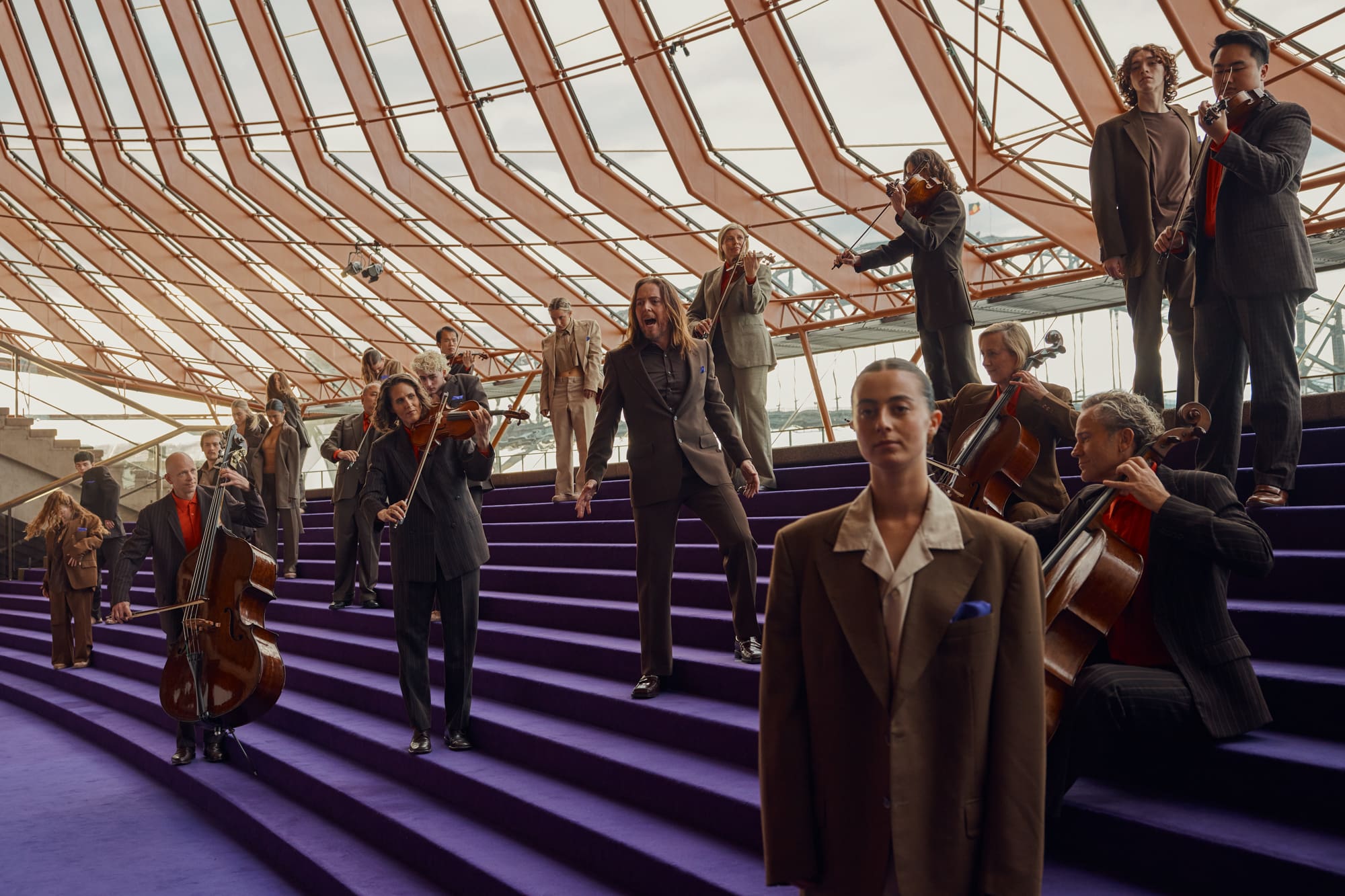 I love the Sydney Opera House and all the things it offers: dance, theatre, orchestra, ballet. I wanted to weave together all those elements into a visual journey: from the restraint and conformity of the brown suit and what it represents, towards the vibrant celebration of creativity at the end. When suit jackets are dropped we reveal the expressive and colourful individuals underneath.”